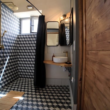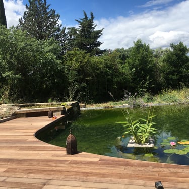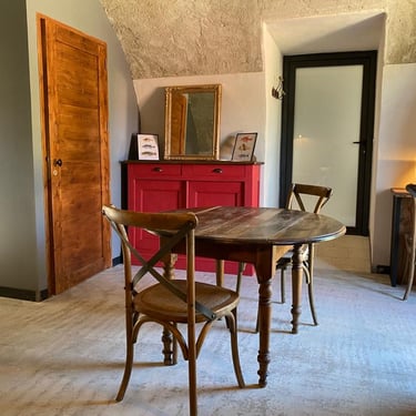 Il est meublé et décoré dans un style brocante chic. Il offre une jolie voute et de vastes volumes sous plafond. Une vue sympathique sur le bassin naturel depuis la petite terrasse privée.