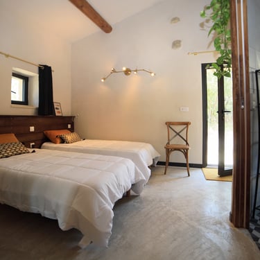Claudius est un studio de 40 m installé dans les anciennes écuries du Mas. Il permet d'accueillir confortablement 2 personnes ou 4 en convertissant la banquette lit en lit queen size. Les lits jumeaux de la chambre se combinent pour offrir un couchage Queen size et une suite de luxe pour les adeptes de la tranquillité et de l'espace.